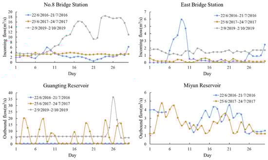 Inflow and outflow of the Guanting Reservoir (number 8 bridge measuring point and east bridge measuring point) 30 days before and after the retrieval date. Compared with Miyun Reservoir in the same period in 2016 and 2017, the annual change of the outbound flow of Guanting reservoir is larger.