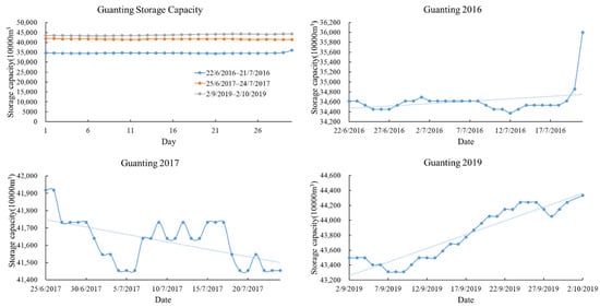 Water storage of the Guanting Reservoir within 30 days before and after retrieval date. From 2016 to 2017, the capacity of the reservoir increased. It had the largest capacity in 2019. From 25 June to 24 July, 2017, the daily variation of the reservoir capacity is large.