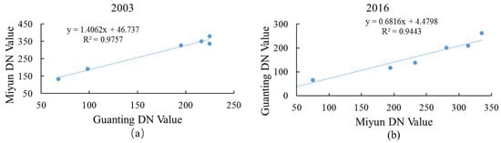 Estimates of regression curves of standard deviation of Landsat image bands’ DN values in Guanting Reservoir and Miyun Reservoir. The value of Guanting reservoir was used as a dependent variable to match the value of Miyun reservoir in 2003 (a). The value of Miyun reservoir was used as the dependent variable to match the value of Guanting reservoir in 2016 (b).