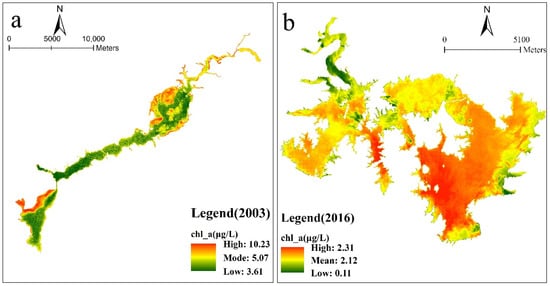 Yuan studied the nutritional status of Guanting Reservoir from January 2003 to June 2014 []. The monthly average values of two monitoring points (Gui1018 + 1: 40.38347° N, 115.779532° E; Gui Bridge: 40.335198° N, 115.69034° E) in the reservoir area recharged by Guishui River were 5.42 and 6.3 μg/L, respectively []. In 2003, the water surface area was small, and the total chlorophyll-a concentration was high. The concentration of chlorophyll-a was higher in the eastern reservoir but lower in the boundary and the Chaobai River inflow area (Figure 10a). According to the Miyun Reservoir estimation model, the values of Guanting Reservoir in 2003 were 5.17 and 4.82 μg/L, respectively. The retrieval results are relatively close to the onsite data of a previous study. According the research of Luan [], in 2016, due to the severe excess of ammonia nitrogen and total nitrogen in the Chaohe River, the eastern area of Miyun Reservoir had a higher level of nutrition than the western area (Figure 10b), which was also consistent with the retrieval results. It was preliminarily proved that the method is feasible, and more efforts should be made to explore and validate in the future study.