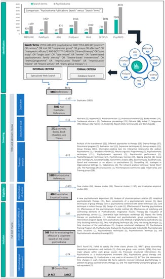 The first specific aim was to determine the scientific production and quality of the controlled trials designed to evaluate the efficacy or effectiveness of psychodrama. To this end, the review combined systematic analysis of a broad range of bibliographic sources with the manual review of references found in the documents returned by the search. The validity of a review depends, to a certain extent, on the documentary sources selected, and according to cost-effectiveness analyses carried out in previous studies, e.g., [], these sources must be selected in accordance with document coverage, topic, geographical area, and language. Thus, for example, in order to avoid publication bias, one of the most important products of the ProQuest database was included, namely ProQuest Dissertations and Theses, which constitutes one of the largest collections of doctoral thesis in the world. Similarly, the contribution made by an open access resource, PubPsych, is also worth mentioning. PubPsych offers access to databases from all over Europe, thereby counteracting one of the most common biases in systematic reviews, the English-speaking bias, which is the result of the greater number of documents written in English [].
