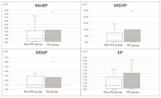 Concentrations of MnBP, MEHP, MiNP, and EP according to the postpartum groups. MnBP, mono-N-butyl phthalate; MiNP, mono-isononyl phthalate; MEHP, mono (2-ethylhexyl) phthalate; EP, ethyl-paraben.