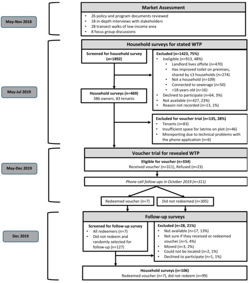 We evaluated the household demand for high-quality, pour-flush latrines through a household survey and a real money voucher trial, which were both conducted from May to December 2019 (Figure 1). After the initial household survey, we randomly distributed discount vouchers to households and measured household redemption to establish their WTP at different price points. Following the voucher trial, we conducted follow-up surveys with a subset of households to understand their voucher redemption decisions. We developed the study design and surveys based on our prior experience with conducting similar WTP studies in Kenya and Tanzania [7,8,11,22].