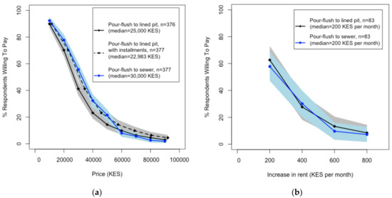 Demand curves for high-quality, pour-flush latrine options derived from survey-based stated WTP information. (a) Stated WTP levels among landowners and homeowners at different price points for the two high-quality latrine options. (b) Stated WTP levels for rent increases among tenants to support the provision of high-quality latrine options. Both groups provided WTP for pour-flush latrines connected to lined pits (black) and pour-flush latrines connected to the sewer (blue); the shaded areas represent 95% confidence intervals. In (a), the solid lines represent the stated WPT in the scenario of one-time payments; the dashed line represents the stated WTP in the scenario of 12 monthly installments.