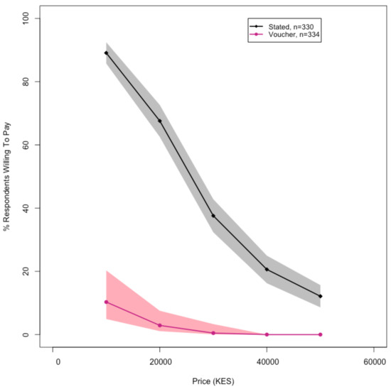 A comparison of stated (black) and revealed (pink) WTP among landowners/homeowners for high-quality, pour-flush latrines connected to a lined waste containment pit. The shaded areas represent 95% confidence intervals. For the stated WTP, the data are only from households that were eligible to receive vouchers. Of the 334 households that were eligible to receive vouchers, we have stated WTP data for 330, since four households answered “don’t know” to the stated WTP question.