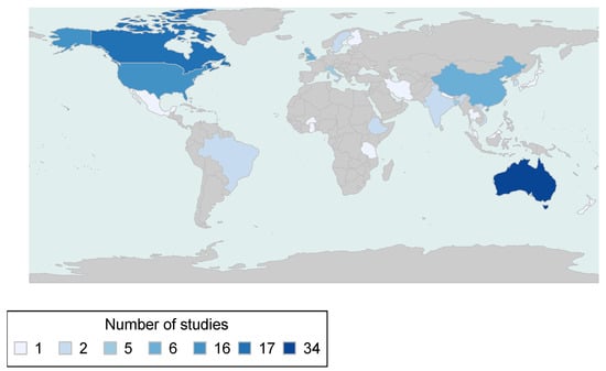 The geographies which represented the most original research studies were Australia (n = 34), Canada (n = 17), USA (n = 16), China (n = 6), United Kingdom (n = 6), Italy (n = 5), and Bangladesh (n = 5) (Figure 2). The majority of studies (77%) were carried out in high-income countries, with 12% from upper middle income, 12% from lower middle income and only 3% from low-income countries (as per World Bank classifications).