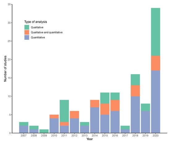Although we searched for studies from 2001 onwards, we did not identify any published before 2007. There was an overall increasing trend in the number of studies between 2007 and 2020, with the highest number in 2020 (34 studies) (Figure 3).