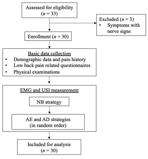 Flowchart of participant recruitment and data collection. EMG: electromyography; USI: ultrasound imaging; NB: natural breathing; AD: abdominal drawing-in; AE: abdominal expansion.