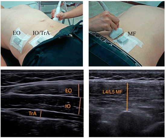 For measurement of the lateral abdominal wall, the USI transducer was placed perpendicular to the mid-axillary line approximately 10 cm lateral to the umbilicus first, and then was adjusted until the anterior edge of the TrA became visible on the screen (Figure 2) [23,24]. For measurement of the MF muscle, the USI transducer was aligned longitudinally along the lumbar spine at the L5-S1 level, and was then moved laterally and angled slightly medially (Figure 2). The same investigator (C. Y. Kao) took all of the USI images of all participants in order to minimize measurement errors during image acquisition.
