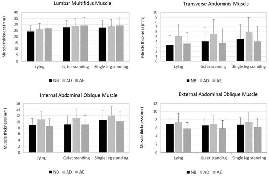 Mean thickness of the lumbar stabilization muscles during natural breathing (NB), abdominal drawing-in (AD), and abdominal expansion (AE) strategies in different body positions. Error bars indicate standard deviations.