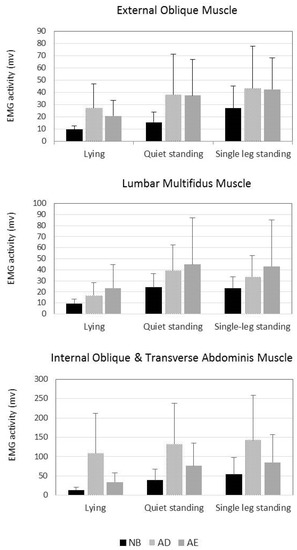 Mean electromyography activity of the lumbar stabilization muscles during natural breathing (NB), abdominal drawing-in (AD), and abdominal expansion (AE) strategies in different body positions. Error bars indicate standard deviations.