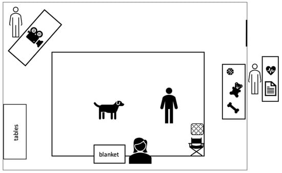 The room was prepared before the intervention began. In front of the room, one of the researchers was located with the questionnaires and the blood pressure monitor for data collection before and after the intervention. In the room, a mat, representing the intervention area, was laid out. Next to the door, a table was located with different toys and treats placed on it. By the wall, centered on the intervention area, a chair for the dog’s owner to sit on was placed. Next to him was the dog’s safe haven, the blanket. Diagonally from it, one of the researchers videotaped the intervention (these data will be analyzed in another study). In addition, the participants were offered a chair and a pillow. The design of the intervention room is shown in