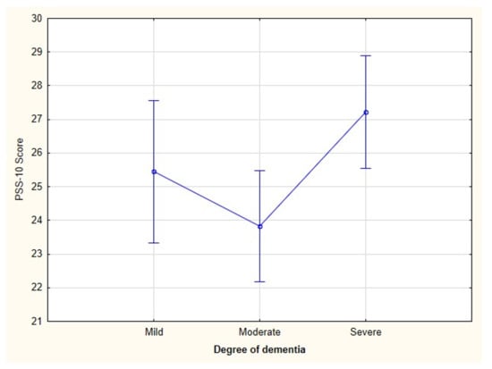 A one-way ANOVA with Scheffé’s post hoc test was conducted to test whether the degree of dementia influenced the PSS-10 scores. Caregivers of charges with moderate dementia scored lower on the PSS-10 compared with caregivers of charges with mild or severe dementia. The largest and statistically significant differences occurred between the moderate dementia and severe dementia groups (p = 0.019 and effect power = 0.72.) (Figure 2).