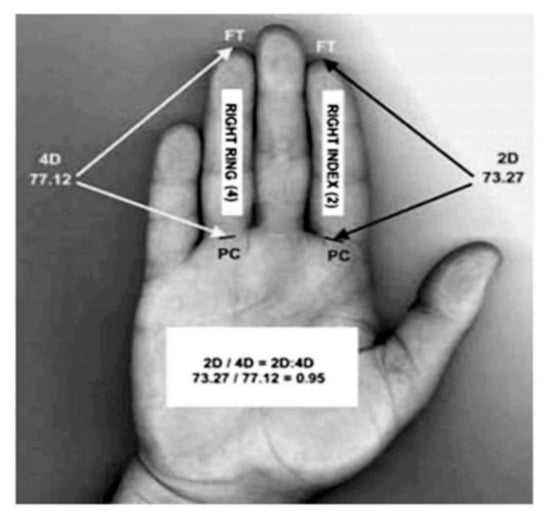 To assess the 2D:4D ratio, each participant’s right hand was scanned on a flatbed scanner, generating images that allow for an accurate measurement of the digit length from the metacarpophalangeal crease up to the fingertip []. The digit ratio was calculated from right-hand measurements because right-hand digit ratios showed higher sex differences, and, thus, they are more sensitive to prenatal androgens [,]. Digit measurement expressed in millimeters (mm) was executed for digit two (2D) and digit four (4D) using a Vernier digital caliper 0–150 mm (Cokraft®, Digital caliper, Sweden) with a precision of 0.01 mm (Figure 1). The 2D:4D ratio was calculated by dividing the 2D length by the 4D length.