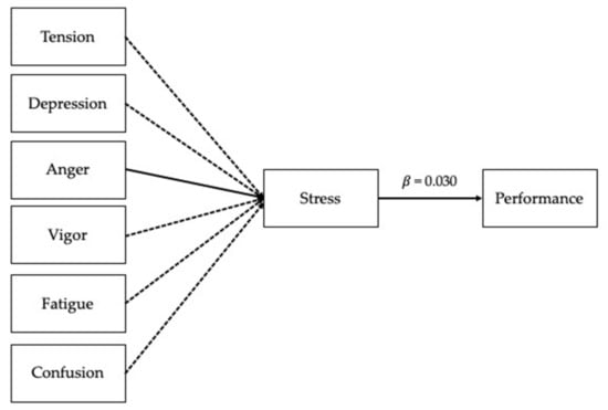 Presently, canoe polo has a growing in popularity in the sporting world. However, no scientific literature regarding the relative impact of the emotional and psychological characteristics of these athletes is available. Several studies mainly investigated the anthropometric [], nutritional [], hormonal [], and physiological [,] requirements of male and female canoe polo players. The research highlighted that many functional alterations in both men and women players result from basic differences in body size and body composition. Nevertheless, women are highly competitive in canoe polo and have the same boat skills and technical ability as men in both slalom and sprint. Based on these arguments and given the limited research, the purpose was to investigate the mediating role of stress in the relationship between mood states and performance in canoe polo. The study presented aims to verify the role that stress plays in the linkage between performance and the six mood dimensions (tension, depression, anger, vigor, fatigue, and confusion). More specifically, we hypothesized the following: