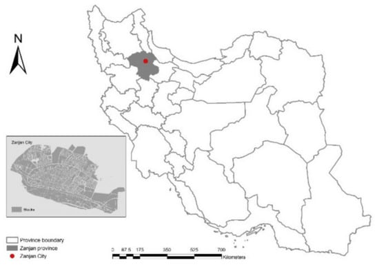 Location of Zanjan province in Iran (right) and a map of Zanjan city structure (insert).