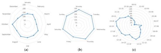 Distribution of road accidents (absolute number) in Zanjan city by month (a), weekday (b) and time (c).