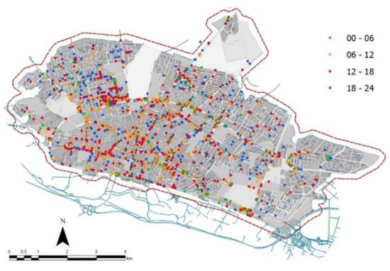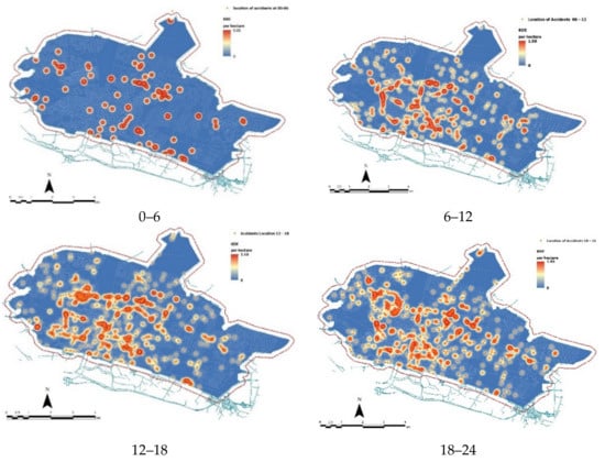 Figure 3 illustrates the spatial distribution of traffic accidents by time (four classes cumulating 6 h of the day each). A high number of accidents occurred downtown along central hours of the day (6–12 and 12–18), when businesses and office are open (Figure 4). Evening collisions (18–24) were also observed in suburban districts.