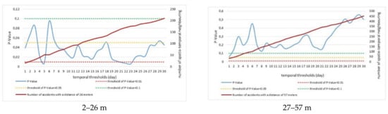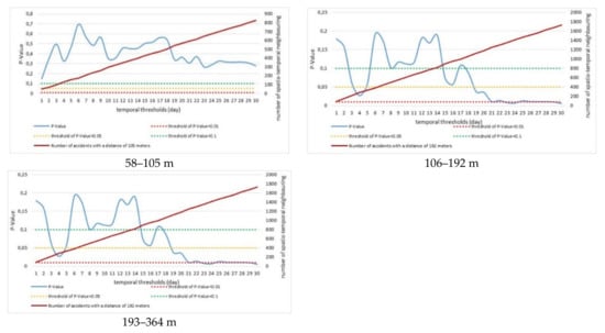 Spatiotemporal interactions of road accidents in Zanjan were illustrated in Figure 5 considering spatial thresholds (p < 0.1, <0.05, <0.01) that reflect three levels of significance (i.e., 90%, 95%, 99% confidence). The blue line in Figure 5 represents a continuous time trend of the probability value associated with Knox statistic against time. The values of this line below a give threshold line (green, yellow, red) indicate statistical significance of such interactions at the same confidence level. Considering a 90% confidence level, spatiotemporal interactions within a 26 m threshold were all significant for all days of the month investigated. Spatiotemporal interactions were found also significant at 95% confidence level for almost all days. A 99% confidence level was observed for spatial interactions at only four days in a month. Conversely, spatiotemporal interactions for the 57 m threshold were significant at a 90% confidence level only for one day. No significant spatiotemporal interactions were observed for the 105 m threshold. Considering the 192 m threshold, significant spatiotemporal interactions at 90%, 95% and 99% confidence levels were observed for 5, 8 and 4 days of a month, respectively. Considering the 364 m threshold, significant spatiotemporal interactions at 90%, 95% and 99% confidence level were observed respectively for 9, 9 and 0 days of a month.