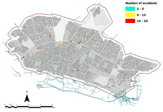 Identification of hazardous locations is one of the most important issues when preventing (or containing) traffic accidents. Transportation planners usually identify ‘risky’ places in an attempt to enhance road safety by undertaking risk reduction actions []. The recognition of ‘risky’ locations or ‘safety black zones’ is the initial step of a comprehensive ‘traffic safety’ analysis []. This investigation stage identifies target locations as the earliest action of a more comprehensive road safety management strategy []. Background information provides a scientific basis for traffic management and regulation, optimizing ‘safety black zones’. To improve safety, it is necessary to consider every component of the urban traffic system. Detecting ‘safety black zones’ and analyzing the spatiotemporal factors affecting car accidents at these sites—as well as undertaking a series of measures to regulate vehicle traffic at these locations—may reduce the risk of collisions, saving human and financial resources [].