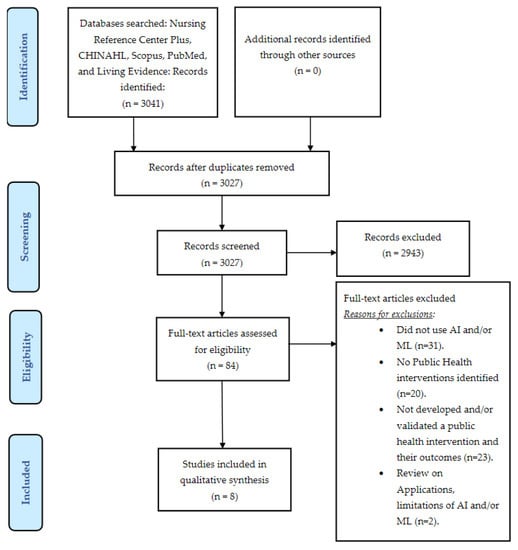 We included all the studies that used AI and/or ML to develop or validate a public health intervention and their possible outcomes. Titles, abstracts, and full texts of articles were screened for eligibility in duplicate by independent reviewers (A.B.P., D.C., D.S.) and discrepancies were resolved through discussion (M.P., K.V.).