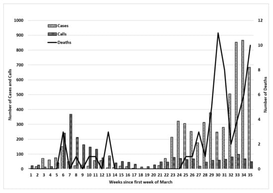 Number of calls to a helpline, cases and deaths over a 35 week period. N.B.: Data collected from daily publication of data by the European Centre for Disease Prevention and Control.