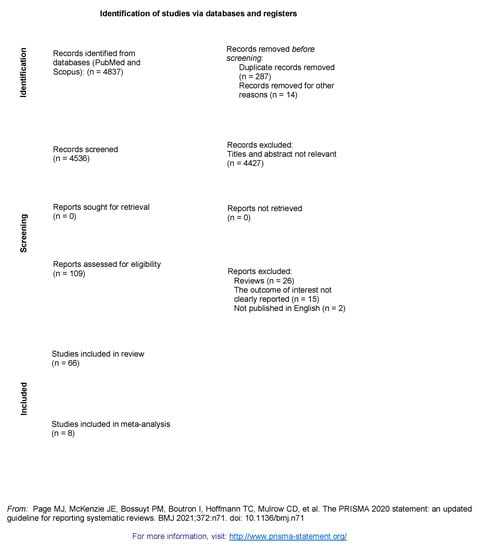 - Liberati, A.; Altman, D.G.; Tetzlaff, J.; Mulrow, C.; Gøtzsche, P.C.; Ioannidis, J.P.A.; Clarke, M.; Devereaux, P.J.; Kleijnen, J.; Moher, D. Standards & Guidelines PRISMA Statement for reporting Systematic Reviews and Meta-Analyses of Studies That Evaluate Health Care Interventions: Explanation and Elaboration. Ann. Intern. Med. 2009, 151, 65–94. [Google Scholar]