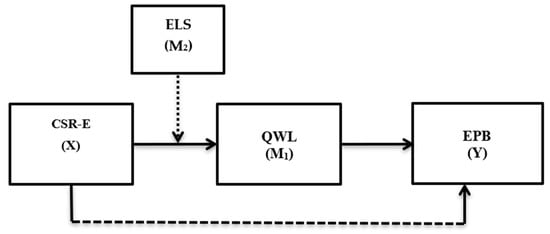 The proposed research model, based on the authors’ conception. This model comprises four variables corporate social responsibility at the employee level (CSR-E) = the independent variable (X), quality of work life (QWL) = the mediating variable (M1), ethical leadership (ELS) = the moderating variable (M2), and employee pro-environmental behavior (EPB) = the dependent variable (Y).