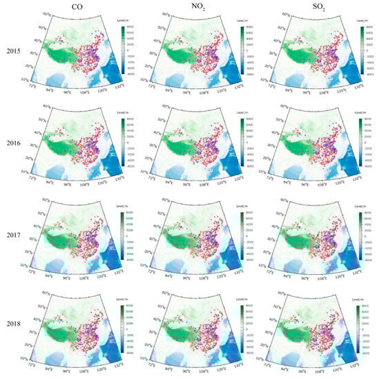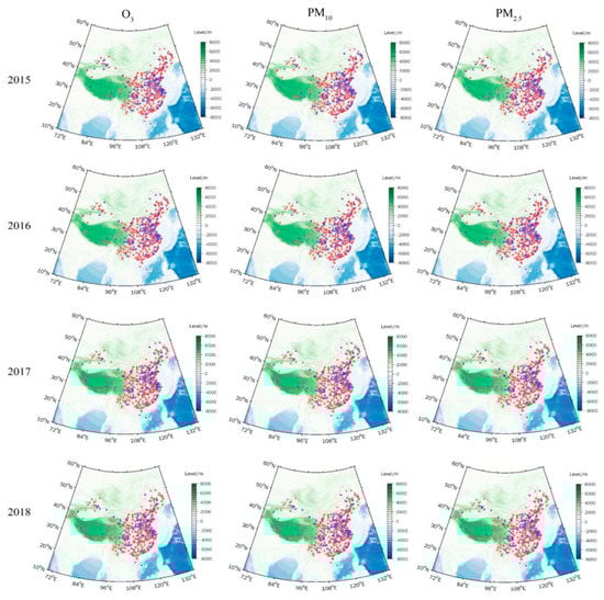 According with the aims of the study, the original air pollution monitoring data derived from the stations was screened and processed. First, we computed daily averages by averaging hourly CO, SO2, NO2, PM2.5, and PM10, and maximum average 8 h O3 values in a day. Missing values in the data were replaced by linear interpolation. For a certain type of monitoring data, if the number was less than eight points in a day, it was considered as the missing value for that day. Second, we calculated the total missing days for the six types of air pollutant during 2015 to 2018. For each monitoring station, if the number of missing days for a type of air pollutant was less than 5% of the year, it would be classified as an “effective monitoring station”. Otherwise, the station was classified as an “invalid monitoring station”. The locations of the effective (red dot) and invalid (blue dot) monitoring stations during 2015 to 2018 are shown in Figure 1. The number of effective monitoring stations for each air pollutant for every year was greater than 1300 (the total number of monitoring stations is 1615), accounting for more than 80% (Table 2), and covering 369 Chinese cites by statistical calculations. To ensure the reliability of the study results, air pollutant data derived from invalid monitoring stations each year were removed in this study.