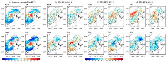 Spatial distributions of seasonal mean AQI in 2015 (a), and the differences of corresponding seasons with the years 2016 (b), 2017 (c), and 2018 (d), respectively. MAM indicates spring, JJA indicates summer, SON indicates autumn, DJF indicates winter.