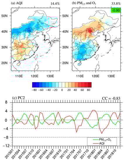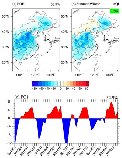 Figure 3 shows the spatial pattern of the leading EOF (EOF1) of the AQI in EC (Figure 3a) and the corresponding PC time series (PC1) for 2015–2018 (Figure 3c). The fractional variance explained by the EOF1 was 52.9%, accounting for more than half of the total variance, which represents a robust mode of spatial and temporal variabilities of the AQI in EC. The spatial pattern of EOF1 was characterized by a uniform structure throughout EC (Figure 3a), which exhibited a relatively large variation in the northern plains of China. The PC1 shown in Figure 3c indicates an obvious annual cycle variation from 2015 to 2018, which means that EAQ was better in summer and worse in winter in EC, consistent with the previous research results [55,56]. Therefore, the EOF1 of the AQI distribution in EC suggests an anti-correlation between winter and summer, which refers to this case as the “winter–summer” mode. Furthermore, the spatial pattern of the mean AQI in the summer half-year (May-September) minus that in the winter half-year (November-next March) was consistent with the spatial pattern of EOF1 during 2015–2018 (spatial correlation coefficient (CC) was 0.94, p < 0.01). Likewise, the same procedure of EOF analysis was applied to the six conventional air pollutants (figures not shown). The EOF1 of each air pollutant was similar to the EOF1 of AQI over EC (except for the leading mode of O3, which had a significant anti-correlation with the EOF1 of AQI). This means that the “winter–summer” mode is a common feature of the variations in each air pollutant in EC.