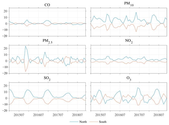 Monthly mean individual AQI anomalies of CO, PM10, PM2.5, NO2, SO2, and O3 in northern (blue lines) and southern (orange lines) Eastern China from 2015–2018.