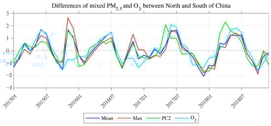 The spatial structure of the second mode of AQI (EOF2) in EC is a north–south dipole pattern, characterized by the EAQ “north good (poor) and south poor (good)” (Figure 4a). The explained variance of EOF2 was 14.4%. The corresponding PC time series of EOF2 (PC2) was not significantly characterized by cycles and trends (Figure 4c). However, since the spring of 2017, the amplitude of PC2 intensity has significantly increased. By calculating the regional average IAQI in northern and southern EC (with 35° N as the boundary), respectively, the IAQIs of the six air pollutants all showed significant anti-correlations between northern and southern EC (CCs < −0.99, p < 0.01). Relative to EC-average IAQIs of CO, PM10, SO2, and NO2, the IAQIs in each month showed negative values over the southern EC and positive values over the northern EC (Figure 5). This indicates that these air pollutants over northern EC are always greater than those over southern EC. However, the IAQI of PM2.5 and O3 averaged over southern and northern EC in each month showed alternating positive and negative changes relative to these averages over EC (Figure 5). Therefore, the EOF2 of AQI was probably caused by the combined effect of PM2.5 and O3. By comparing the difference between the PC2 and the IAQIs (the average values over the northern EC minus the average values over the southern EC) of O3 and PM2.5, respectively (Figure 6), the changes of O3 during 2015–2018 follow that of the PC2 closely (CC = −0.58, p < 0.01). By combining the changes of PM2.5, the CC with PC2 was significantly increased (CC = −0.83, p < 0.01). Furthermore, the mean and standard deviation of O3 concentration over EC has shown an increased intensity since 2017, especially in summer. This indicates that O3 has become more serious and widespread in EC during 2015–2018, which is also in line with the characteristics of the increased amplitude of PC2 since the spring of 2017. The EOF2 of the combined mean IAQIs of PM2.5 and O3 (Figure 4b) exhibited an obvious north–south dipole pattern (CC = −0.90, p < 0.01), and the explained variance was 20.40%, which is slightly lower than its EOF1 explained variance (31.4%, figure not shown).