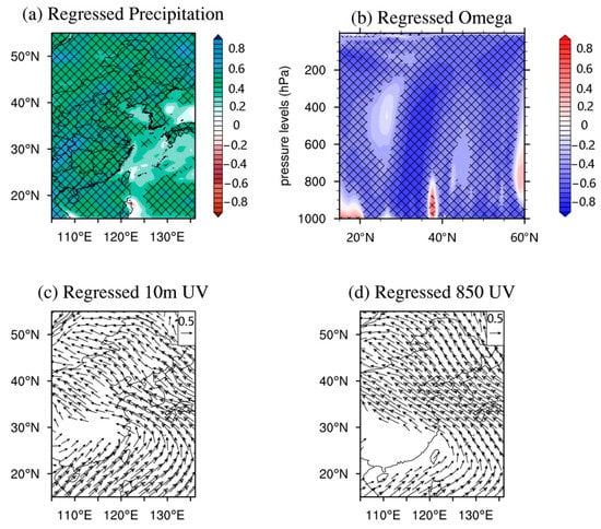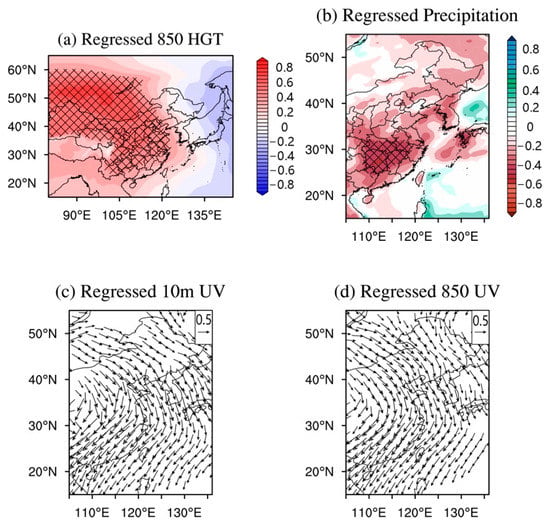 Regressed 850 hPa geopotential height (a), precipitation (b), surface wind at 10 m (c), and 850 hPa wind (d) on the AQI PC2. The black crosses in panel (a,b) represent the region with regression significant at a 99% confidence level, shown in panel (c,d) are only wind vectors that are significant above a 99% confidence level.