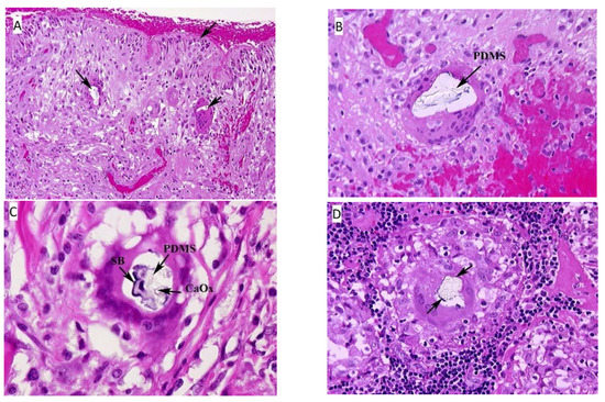 (A) Fibrous capsule surrounding the implant, right. The surface of the tissue lies adjacent to the silicone breast implant and forms the “pseudosynnovium.” This pseudosynnovium is composed of amorphous eosinophilic material and mononuclear cells. Of note are several foreign body giant cells containing clear silicone gel. There is a chronic inflammatory infiltrate scattered among the fibroblasts, fibrous tissue, and collagen. (HE, 10×). (B) Fibrous capsule surrounding implant, right. A high-power view of the above tissue shows silicone gel within the giant cell that is embedded in fibrous tissue. There are also scattered chronic inflammatory cells, congested blood vessels, and surgical related hemorrhage. (HE, 100×). (C) Fibrous capsule surrounding implant, left. High power view of previous section. In the center of the multinucleated giant cell are fragments of Schaumann body (annotated on the image as SB), and refractile clear crystalline material consistent with calcium oxalate (annotated on the image as CaOx). (HE, 100×). (D) Axillary lymph node, left. There is clear refractile globular material in the center of the giant cell of the epithelioid granuloma consistent with silicone gel. In addition, fragments of a Schaumann body can be seen around the outer edge of the silicone gel. (HE, 100×). Arrows on the HE images, unless designated point towards areas of interest such as migrated PDMS.