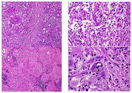 (A) Eyelid nodule, left. This section contains both normal serous glands of the eyelid (right), and fibrous tissue surrounding a non-caseating granuloma with central foreign body giant. (HE, 10×); (B) Eyelid nodule, left. This section shows a non-caseating granuloma with a Schaumann body within the foreign body giant (center). (HE, 100×); (C) Lower leg nodule, left. There are aggregates of varying-sized epithelioid granulomas, fibrous tissue septae, and scattered lymphocytes. (HE, 10×); (D) Lower leg nodule, left. The section contains a non-caseating granuloma with scattered lymphocytes and several multinucleated giant cells in a fibrous tissue background. The giant cell in the center, indicated by the black arrow, contains two Schaumann bodies. (HE, 100×).