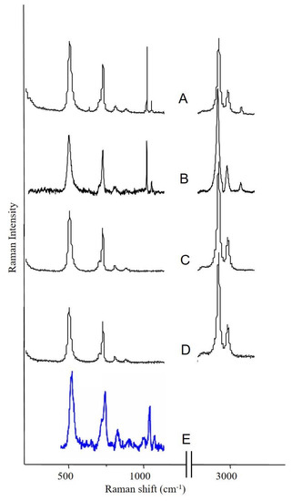 Raman spectroscopy analysis of the silicone breast implant: (A) spectrum of silicone migrated to fibrous tissue surrounding the implant; (B) spectrum of silicone obtained from the shell of the “explant”; (C) spectrum of silicone gel obtained from the inside of the “explant”; (D) reference PDMS material; (E) spectrum of the silicone obtained from the axillary lymph node.