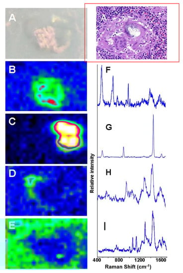 Raman spectroscopy generated images of silicone migrated to axillary lymph node: (A) white light and HE image; (B) Raman generated image based on the distribution of silicone shown in spectrum (F); (C) Raman image based on distribution of oxalate shown in spectrum (G); (D) Raman image based on the distribution of phosphate shown in spectrum (H); (E) Raman image of tissue around the migrated silicone; (I) Raman spectrum from the tissue surrounding the phenyl silicone and Schaumann body.