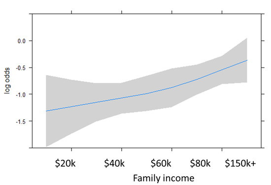 Spline model depicting the risk of ALS by family income (p = 0.00030). Blue line represents the log odds and the grey shading depicts the 95% CI.