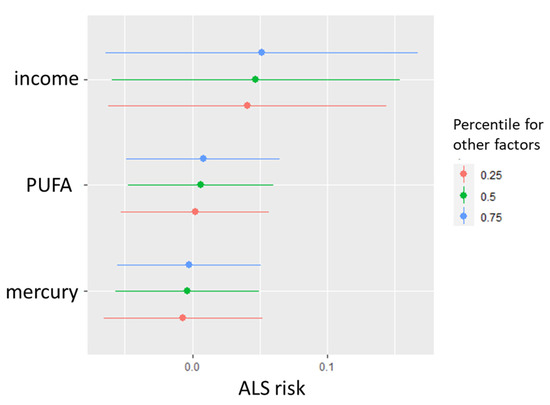 Figure 4 shows a Bayesian Kernal Mixture Model of income, intake of mercury, and omega-3 PUFA in relation to ALS risk. Mercury and omega-3 PUFA intakes did not show a relationship with ALS risk, hovering around 0.0. The increased risk associated with income did not vary by 25th, 50th, and 75th quartiles of mercury and omega-3 PUFA intake.