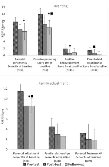 A significant reduction in scores was noted on all parenting subscales (except for parental teamwork) and on the family adjustment subscale, parental adjustment, between t1 and t2 in families who scored over the 70th percentile on each PAFAS subscale at baseline (Figure 1). Within this subgroup of families, significant changes over time were found on the all the following subscales: Parental Consistency (F(2,16) = 6422, p = 0.009, partial η2 = 0.45), Coercive Parenting (F(2,14) = 26.275, p < 0.001, partial η2 = 0.79), Positive Encouragement (F(2,20) = 7.679, p = 0.003, partial η2 = 0.43), Parent–child Relationship (F(1.200, 10.798) = 9.387, p = 0.009, partial η2 = 0.51) Parental Adjustment (F(2,14) = 15.494, p < 0.001, partial η2 = 0.69) and Family Relationships (F(2,14) = 4.200, p = 0.037, partial η2 = 0.38). Scores reached the lowest values at t3, being statistically significantly lower than at t1 in post-hoc tests within the Coercive Parenting, Parent–child Relationship and Parental Adjustment subscales. Families scoring above the 70th percentile on baseline (t1) on parental teamwork while consistently lowering the average score from t1 to t2 and then to t3 did not register a statistically significant change overall.