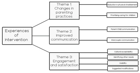 Overall, eight participating caregivers and six facilitators took part in interviews. Table 2 presents the gender and age of participants. Three main themes emerged: changes in parenting practices, improved communication, and engagement and satisfaction. Each is described and illustrated with quotes provided (identified according to Caregiver (C), or facilitator (F)). Figure 2 illustrates the thematic map of the results of the qualitative analysis.