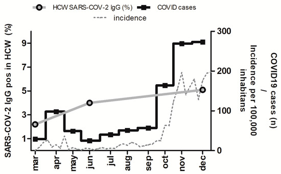 HCW of the University Hospital Essen were asked to take part in the study. Participants were grouped according to the frequency of contact with COVID-19 patients: (I) a high-risk group with daily contact with COVID-19 patients on designated wards and on intensive care units, (II) an intermediate-risk group with daily contact with patients without known COVID-19, and (III) a low-risk group without daily patient contact. The three periods of sampling were (a) 25 March 2020 until 27 May (b) 1 June until 24 July and (c) 1 October until 15 December 2020. SARS-CoV-2 seroprevalence was evaluated using an approved and CE-labelled anti-SARS-CoV-2 IgG ELISA (Euroimmun Medizinische Labordiagnostika, Lübeck, Germany), which recognizes IgG antibodies specifically binding to the SARS-CoV-2-encoded spike protein subunit 1 (S1). To compare the estimated seroprevalence in HCW with the incidence of the area’s population, the SARS-CoV-2 incidence of the district of Essen was prompted from the Robert-Roch-Institut (https://survstat.rki.de (accessed on 22 February 2021)). In addition, a plaque reduction neutralization test was performed on 18 of 19 participants being tested for SARS-CoV-2 IgG in the ELISA to evaluate the serum neutralizing activity as described before [5]. The course of the signal-to-cut-off ratio (S/CO) of participants who tested positive in the ELISA and the course of the neutralizing test were further analyzed at baseline and during the observational period.