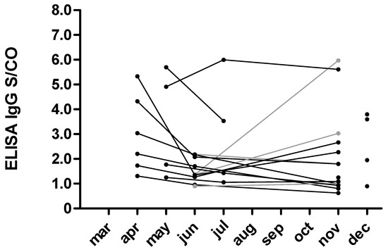 SARS-CoV-2 IgG follow-up data from the 10 participants who tested positive in the first observational period were available with a mean follow up of 4.0 ± 1.24 months (Figure 2). The S/CO for the SARS-CoV-2 IgG antibodies decreased by −0.41 ± 2.06. The two previously mentioned seroreverting participants tested negative for SARS-CoV- IgG by ELISA at the last visit after 4 and 5 months, respectively. However, neutralizing antibodies could still be detected using the neutralization assay.