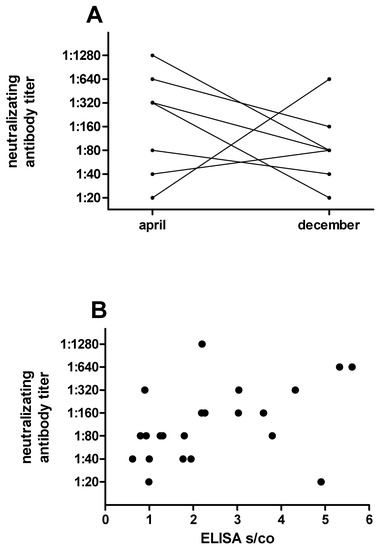 Follow up data was available for nine patients after 4.5 ± 0.72 months. In five participants, the specific IgG-titer decreased, in two others the titer increased, and two had no detectable neutralization antibody titers in either sample (Figure 3A). No follow up data was available for the third participant without neutralization activity. The neutralizing antibody titers and ELISA S/CO values (26 pairs) did not correlate well (r = −0.26, p = 0.20, Figure 3B).