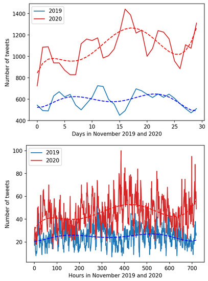 S1 data visualization. Day-by-day and hour-by-hour number of tweets legitimately complaining of back pain. Legend: November 2019 data is in blue, November 2020 data is in red. The dotted lines are trend lines where trend was computed as a 6th order polynomial curve. The colors of the curves match the color of the data plots.