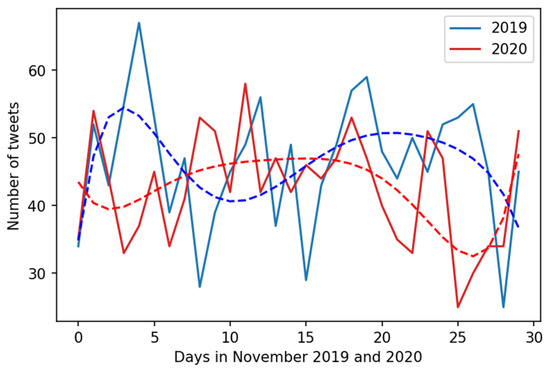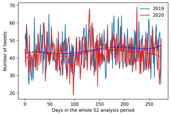 S2 data visualization. Day-by-day number of tweets legitimately complaining about back pain according to Twitter data localized in the USA. Legend: 2019 data is in blue and 2020 data in red. The dotted lines are trend lines where trend was computed as a 6th order polynomial curve. The colors of the curves match the color of the data plots.