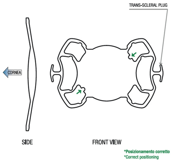 - Rossi, T.; Iannetta, D.; Romano, V.; Carlevale, C.; Forlini, M.; Telani, S.; Imburgia, A.; Mularoni, A.; Fontana, L.; Ripandelli, G. A novel intraocular lens designed for sutureless scleral fixation: Surgical series. Graefes. Arch. Clin. Exp. Ophthalmol. 2021, 259, 257–262. [Google Scholar] [CrossRef]