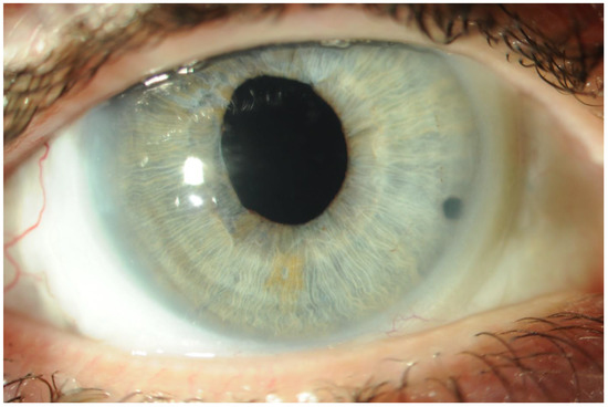 Bilateral lens ectopia was monitored at the Ophthalmology Department. The refractive error—myopia—was regularly corrected ultimately stabilizing at −5.0 diopters. In September 2007, due to severe left eye visual acuity decrease, a decision was made to operate the patient for a subluxated lens. Extraction of the subluxated lens was performed along with anterior vitrectomy and trans-scleral fixation of the intraocular lens. Visual acuity in the left eye improved from 1/50 with −5.0 diopters correction to 5/25 with no correction. Two years later, the procedure was performed on the right eye with visual acuity improvement from 1/50 to 5/25 with no correction. The patient was followed up for the next two years; no postoperative complications were seen. Due to ocular trauma in 2011, the intraocular lens luxated into the vitreous cavity in the right eye. Pars plana vitrectomy was performed with the IOL resutured into the sclera. The patient was discharged with uncorrected visual acuity of 5/50. For the next six years, there was kept regular follow-up appointments without reporting any complaints. In August 2018, the patient was admitted to the Ophthalmology Department with a progressive visual acuity decreased in the right eye. Retinal detachment with macular involvement was diagnosed while both IOLs were correctly positioned. The patient underwent pars plana vitrectomy with silicone oil endotamponade and successful retinal reattachment. Three months later, the silicone oil was removed. A follow-up examination revealed right IOL dislocation. A decision was made to extract the subluxated rigid polymethyl methacrylate (PMMA) lens (fixated at 3th and 9th hour); a wide 5-mm incision was made at the limbus (to remove rigid polymethyl methacrylate (PMMA) intraocular lens.) A sutureless SOLEKO FIL SSF Carlevale lens was fixated at 12th and 6th hour. Considering several previous interventions (suture scleral fixation) and the risk of another dislocation, a sutureless option was selected.