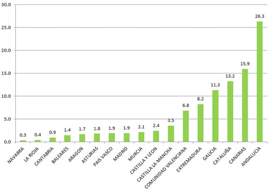 Regarding projects related to urban development, the EU considers it necessary to support initiatives towards the new economic, environmental, climatic, demographic, and social challenges that affect urban areas. Figure 1 shows the distribution of ERDF funds among the Spanish regions for the 2014–2019 period. It shows how the region of Andalusia received 26.3% of the total resources. On the opposite side are La Rioja and Navarra with 0.4% and 0.3%, respectively.